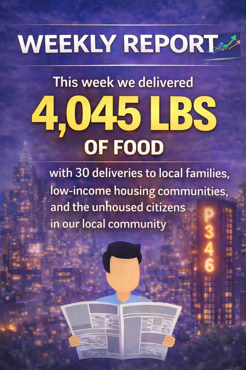 This week we delivered 4,045 lbs of food with deliveries to 21 local families in need, 7 deliveries to low-income housing communities, and 2 homeless outreach food distributions.